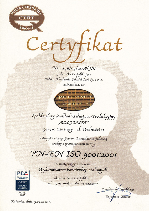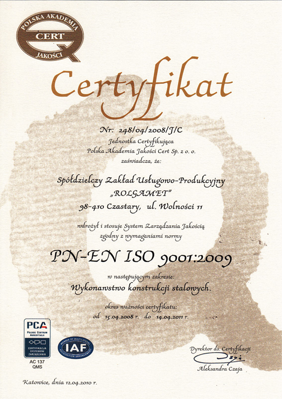 Celem naszej firmy jest pełne zaspokojenie potrzeb i oczekiwań klienta poprzez najwyższą jakość wykonywanych produktów zgodnych z obowiązującymi normami. W roku 2008 firma wprowadziła system zarządzania jakością PN-EN ISO 9001:2001 od 2010 roku ISO 9001:2008.